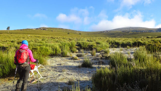 La bajada hacia el valle la haremos sin sendero definido, buscando espacios entre las escobas hasta alcanzar el nacimiento del arroyo, donde encontraremos a su izquierda un sendero ganadero que iremos siguiendo hasta unas zonas de pasto despejadas.